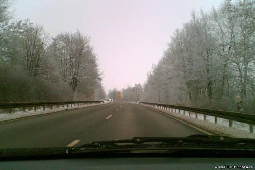 Утром была хорошая погода, -6° и без ветра. Ездил в соседний город, всё было покрыто изморозью... Красота! Сфотографировал телефоном, поэтому качество оставляет желать лучшего... На самом деле было красивее.
